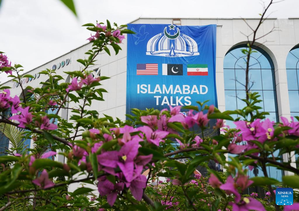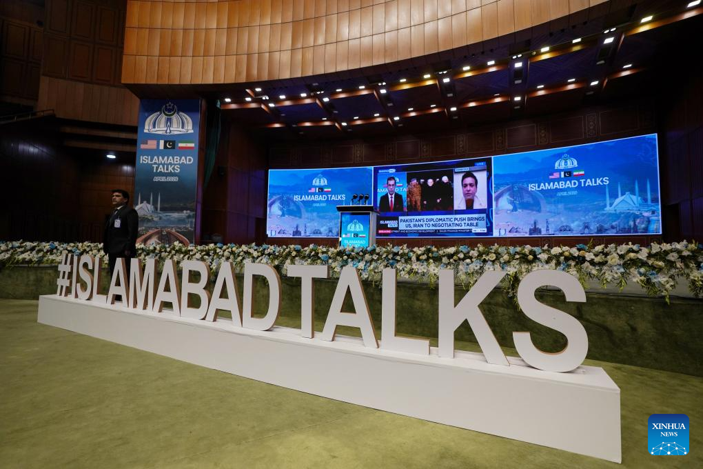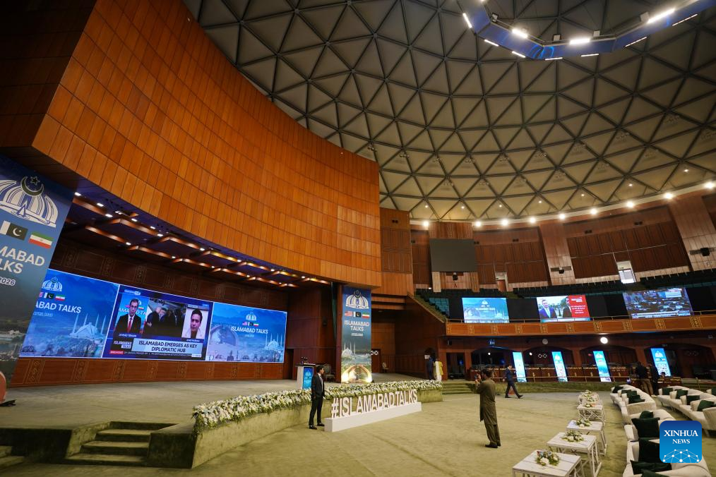 This photo taken on April 11, 2026 shows an exterior view of the press center for the talks between the United States and Iran in Islamabad, Pakistan. The United States and Iran are expected to have a negotiation in Islamabad to end recent hostilities in the Middle East. (Xinhua/Wang Shen)
