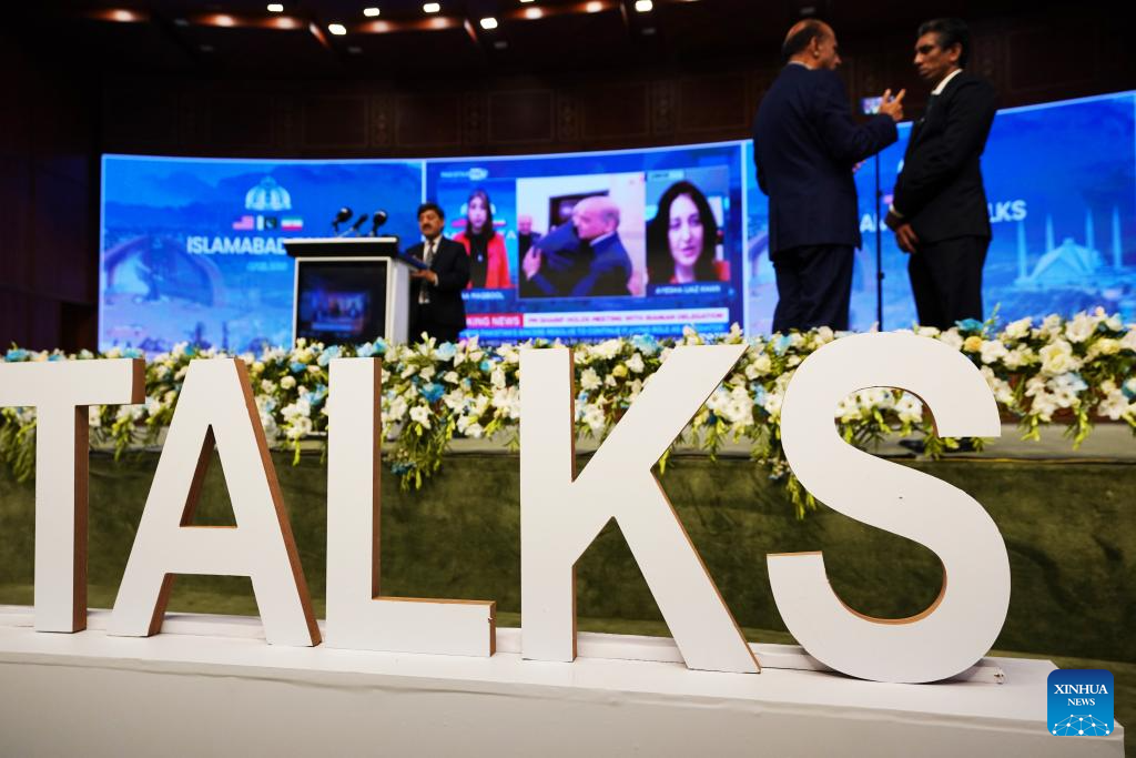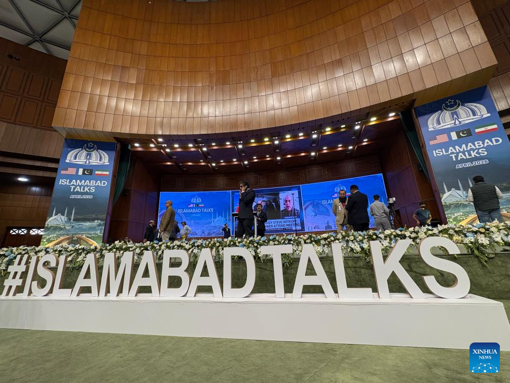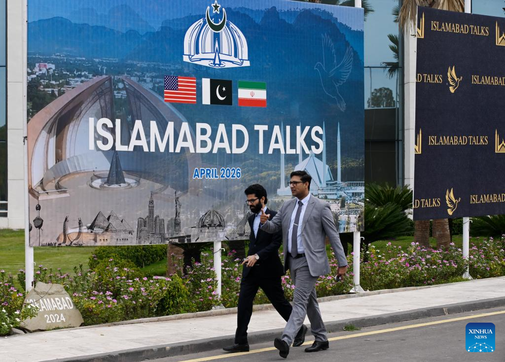 People walk past the press center for the talks between the United States and Iran in Islamabad, Pakistan, April 11, 2026. The United States and Iran are expected to have a negotiation in Islamabad to end recent hostilities in the Middle East. (Xinhua/Wang Shen)