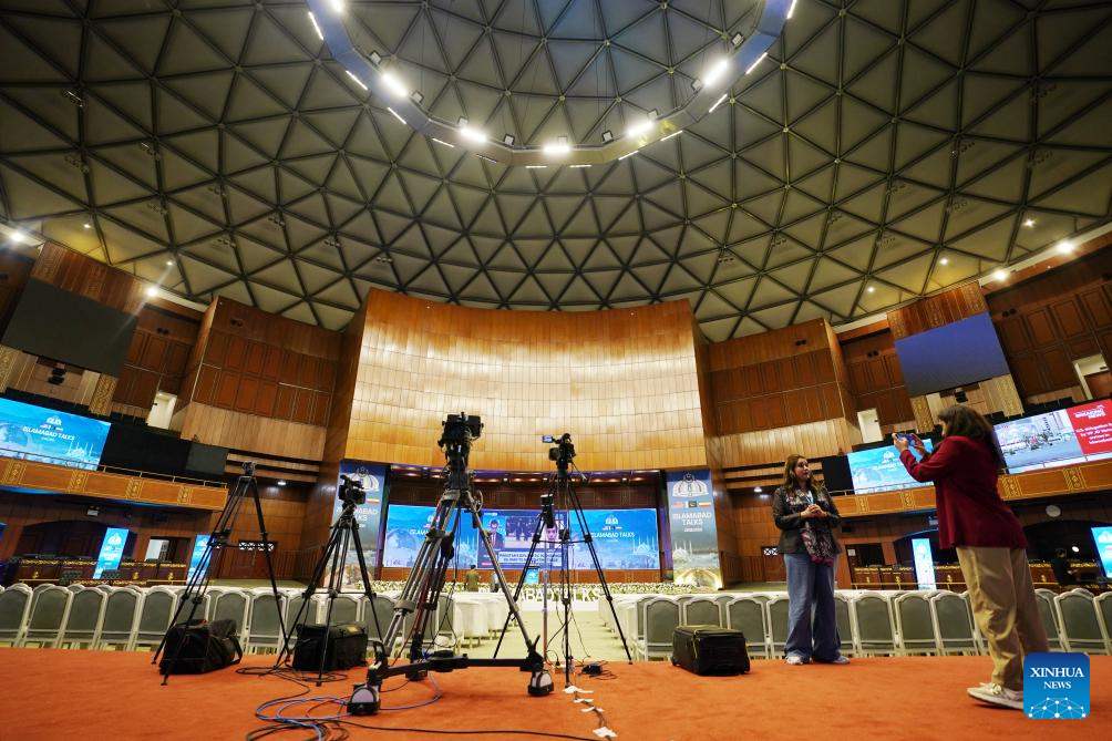 This photo taken on April 11, 2026 shows an interior view of the press center for the talks between the United States and Iran in Islamabad, Pakistan. The United States and Iran are expected to have a negotiation in Islamabad to end recent hostilities in the Middle East. (Xinhua/Wang Shen)