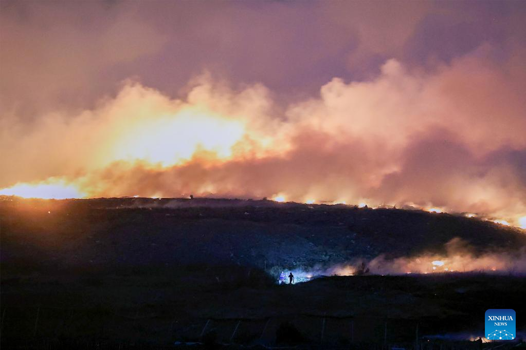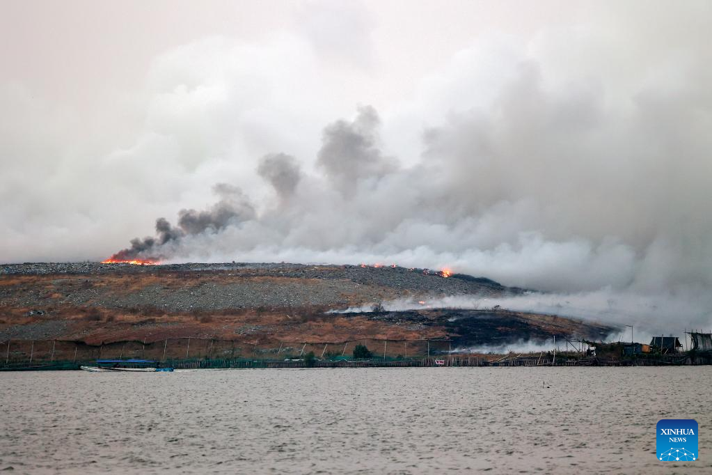 Smoke billows from the blaze at a landfill in Navotas City, the Philippines, April 11, 2026. Metro Manila has been shrouded in thick haze for days due to a landfill fire, local media reported Sunday. The fire broke out on April 10 in Navotas City, spreading smoke across multiple cities and severely affecting air quality. Air Quality Index (AQI) readings on Saturday classified air conditions as "unhealthy" to "acutely unhealthy," according to local media. (Str/Xinhua)