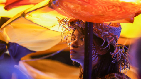 People in costumes march with colorful lanterns during annual Lantern Parade at University of the Philippines