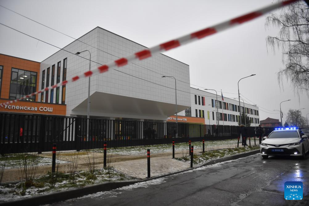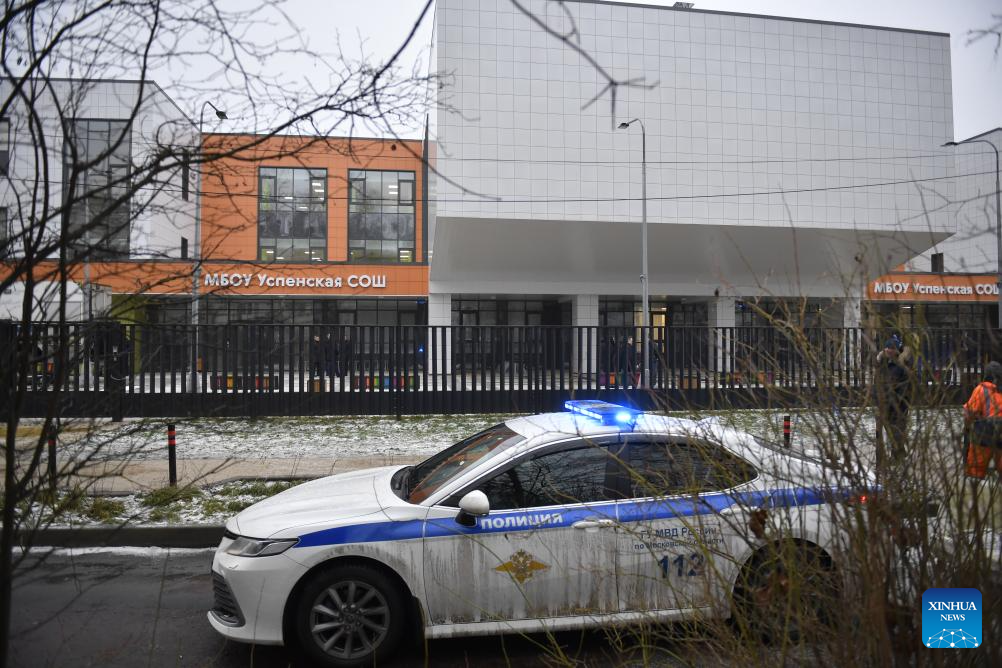 This photo taken on Dec. 16, 2025 shows the site of a school stabbing in Moscow, Russia. A student was fatally stabbed by a minor, who also wounded a security guard, at an educational institution in the Moscow region early Tuesday, the Russian Investigative Committee said. The incident occurred at the Gorki-2 settlement in the western district of Odintsovsky, the committee said, adding that a criminal case has been initiated. (Photo by Alexander Zemlianichenko Jr/Xinhua)