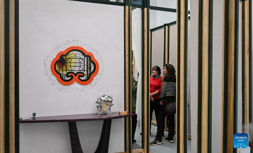 Visitors listen to an introduction on exhibits during an exhibition titled "Anshan Cuijin - an Exhibition of Chinese Life Aesthetics" at the China Cultural Center in Madrid, Spain, Dec. 16, 2025. The exhibition kicked off here on Tuesday and will run until March 2026, presenting the elegant charm of Chinese aesthetics. (Xinhua/Cheng Min)