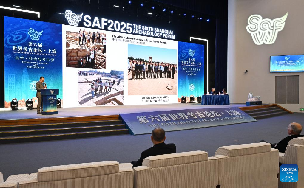 An Egyptian scholar introduces a Sino-Egyptian archaeological team's joint archaeological efforts in Luxor's Karnak Temple complex during the sixth Shanghai Archaeology Forum (SAF2025) in Shanghai, east China, on Dec. 16, 2025. Jointly hosted by the Chinese Academy of Social Sciences, Shanghai Municipal People's Government and the National Cultural Heritage Administration of China, the SAF2025 themed on "Technology, Society and Archaeology" has attracted nearly 300 experts and scholars from over 40 countries and regions around the world to attend. (Xinhua/Li He)
