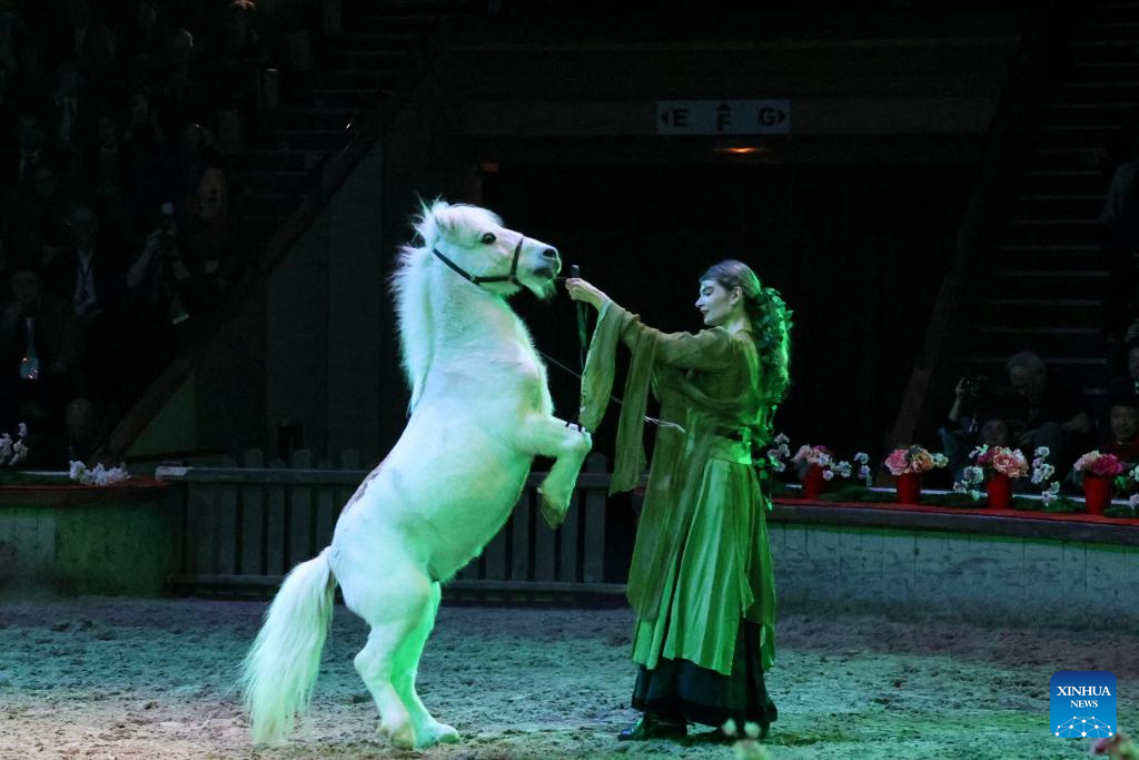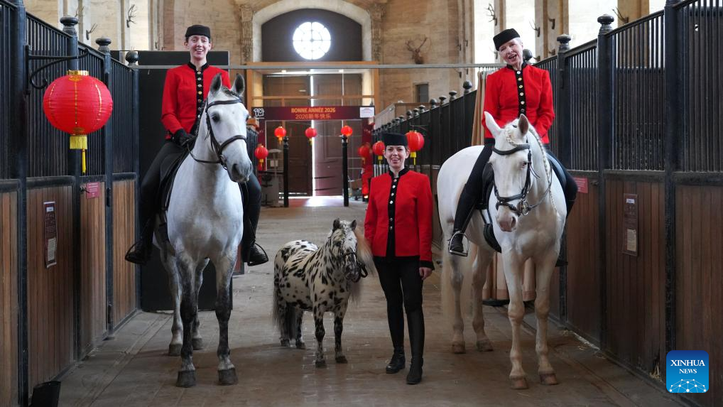 A traditional French equestrian performance is staged during a gala celebrating the Chinese Year of the Horse at the Great Stables in the estate of the Chateau de Chantilly in the Hauts-de-France region, France, Feb. 11, 2026. Co-hosted by the Hauts-de-France regional authorities and the Chinese Embassy in France, the event was distinct from many other Chinese New Year activities. At the Great Stables, the highlight was a distinctly local art form: traditional French equestrian performance.(Xinhua/Cui Kexin)