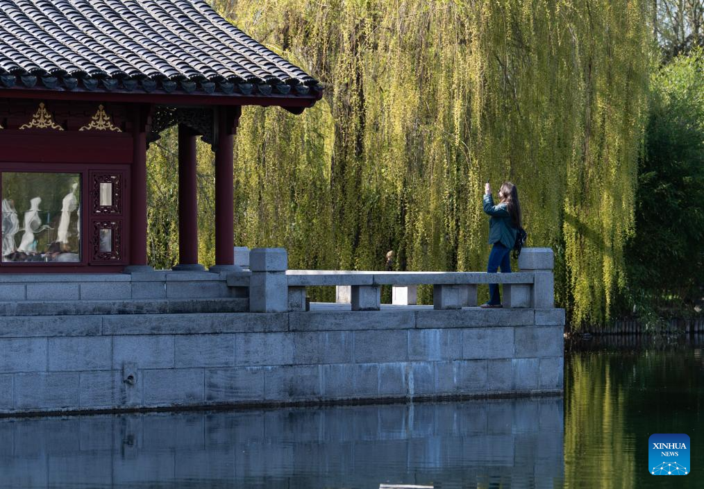 A woman visits the Chinese Garden during the Cherry Blossom Festival at the Gardens of the World in Berlin, Germany, April 11, 2026. Around 25,000 visitors are expected to participate in the 18th Cherry Blossom Festival. (Xinhua/Zhang Haofu)