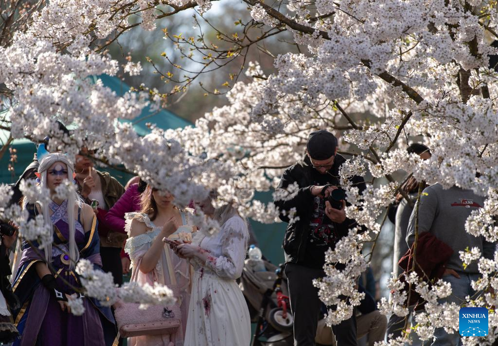 People enjoy themselves under cherry blossoms during the Cherry Blossom Festival at the Gardens of the World in Berlin, Germany, April 11, 2026. Around 25,000 visitors are expected to participate in the 18th Cherry Blossom Festival. (Xinhua/Zhang Haofu)