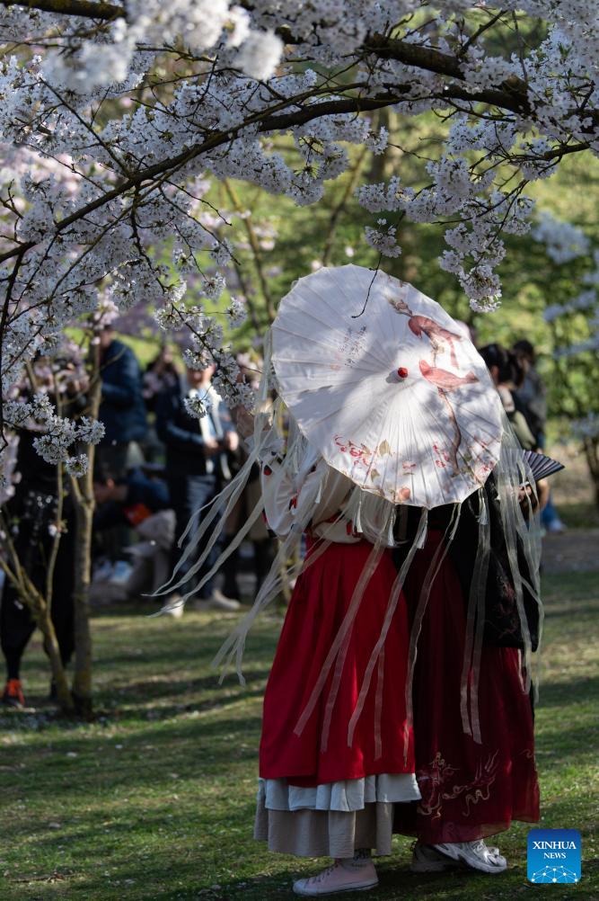 A woman takes photos of cherry blossoms during the Cherry Blossom Festival at the Gardens of the World in Berlin, Germany, April 11, 2026. Around 25,000 visitors are expected to participate in the 18th Cherry Blossom Festival. (Xinhua/Zhang Haofu)