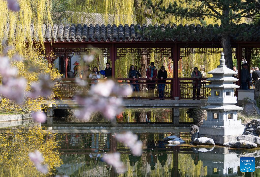 People visit the Chinese Garden during the Cherry Blossom Festival at the Gardens of the World in Berlin, Germany, April 11, 2026. Around 25,000 visitors are expected to participate in the 18th Cherry Blossom Festival. (Xinhua/Zhang Haofu)