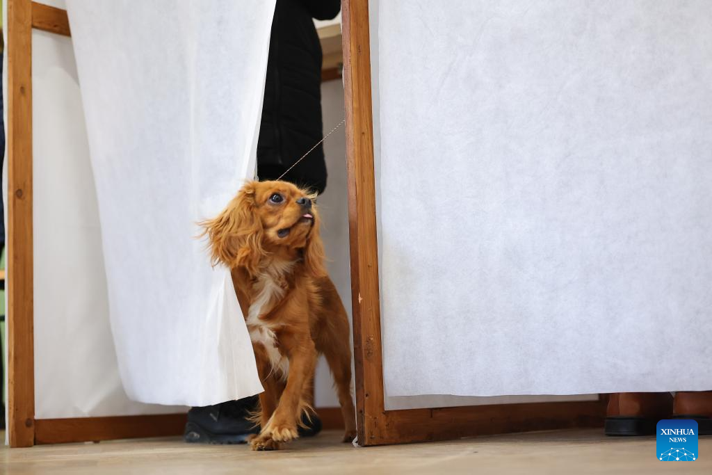 A dog accompanies its owner at a polling station in Budapest, Hungary, April 12, 2026. Hungary's parliamentary elections kicked off at 6:00 a.m. local time (0400 GMT) on Sunday, with about 8.1 million eligible voters, according to the National Election Office. (Photo by David Balogh/Xinhua)