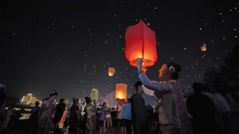 People fly Kongming lanterns in Jinghong, China's Yunnan