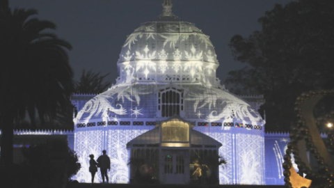 People watch light show at Conservatory of Flowers in Golden Gate Park of San Francisco