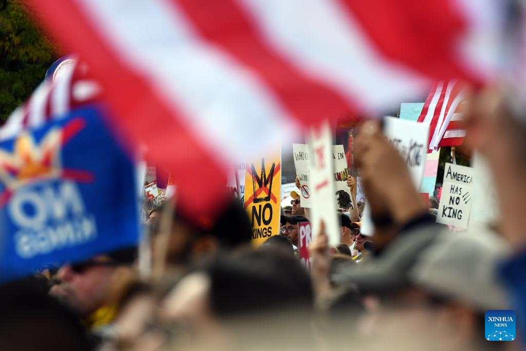 Following the first nationwide "No Kings" protest on June 14, this round of rallies, spanning all 50 states, came as the federal government shutdown entered its 18th day with no resolution in sight. (Xinhua/Li Rui)