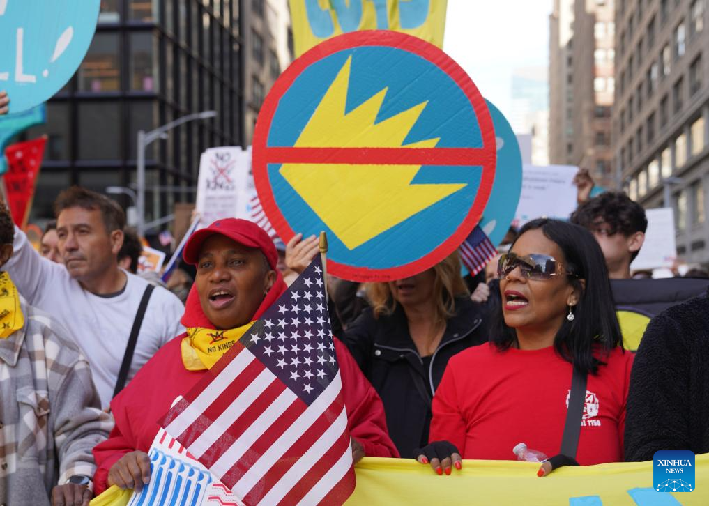 People take part in a "No Kings" protest in Manhattan, New York, the United States, on Oct. 18, 2025. Tens of thousands of people took to the streets across 2,700 U.S. cities and towns on Saturday for the second round of the nationwide "No Kings" protests, the largest single-day demonstration in American history.